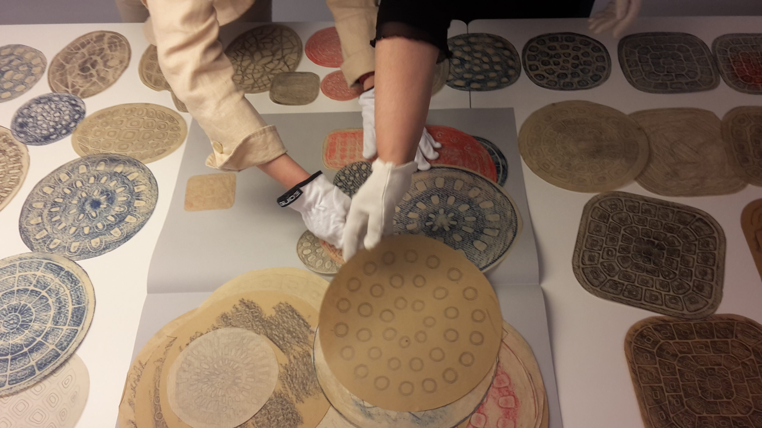 En utställning blir alltid till genom ett urval. Vad ska med och vad ska inte med? Och hur fungerar urvalet tillsammans i rummet? På bilden ser ni när vi i ett tidigare skede väljer ut skisser till så kallat Ravenna glas av Sven Palmqvist.