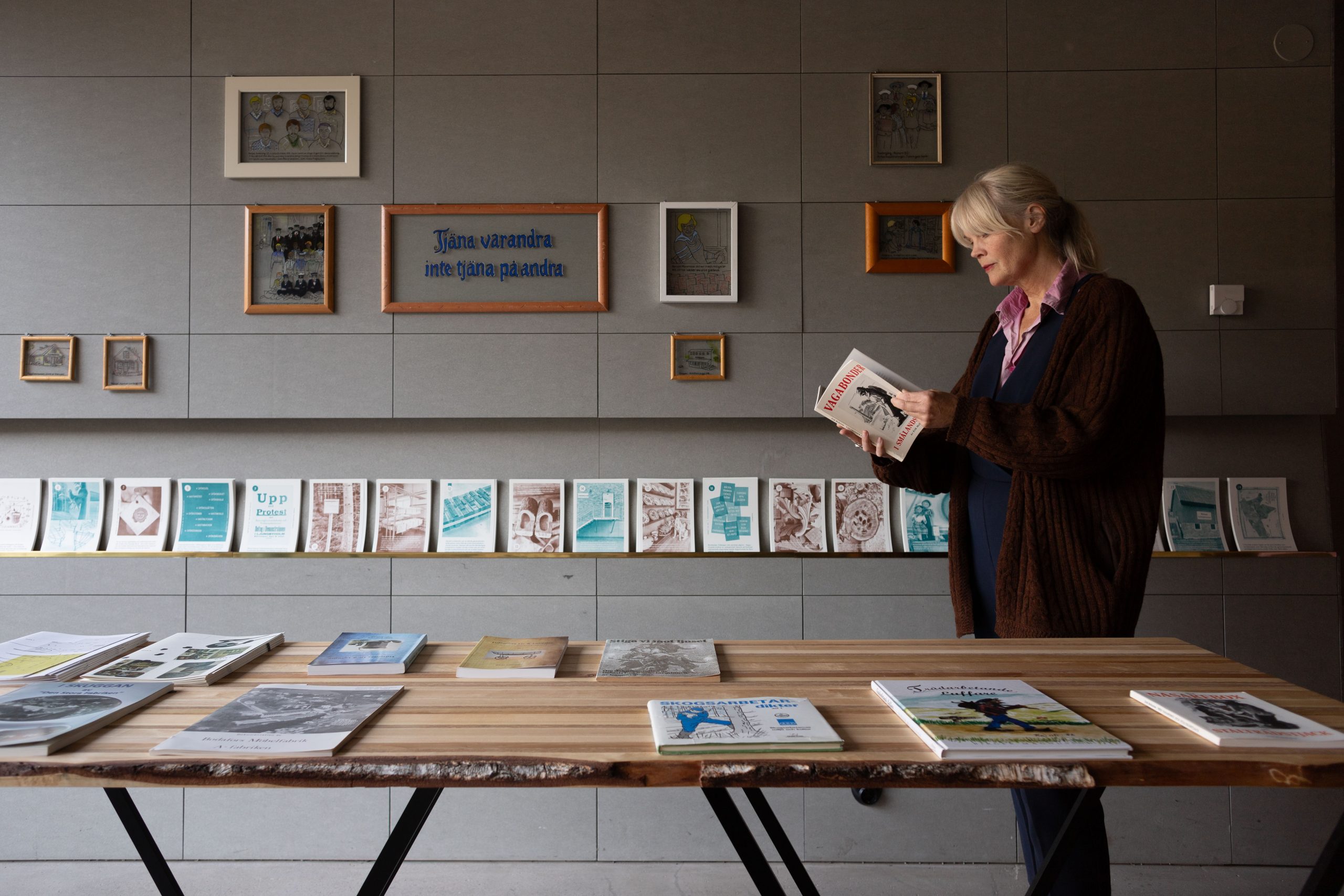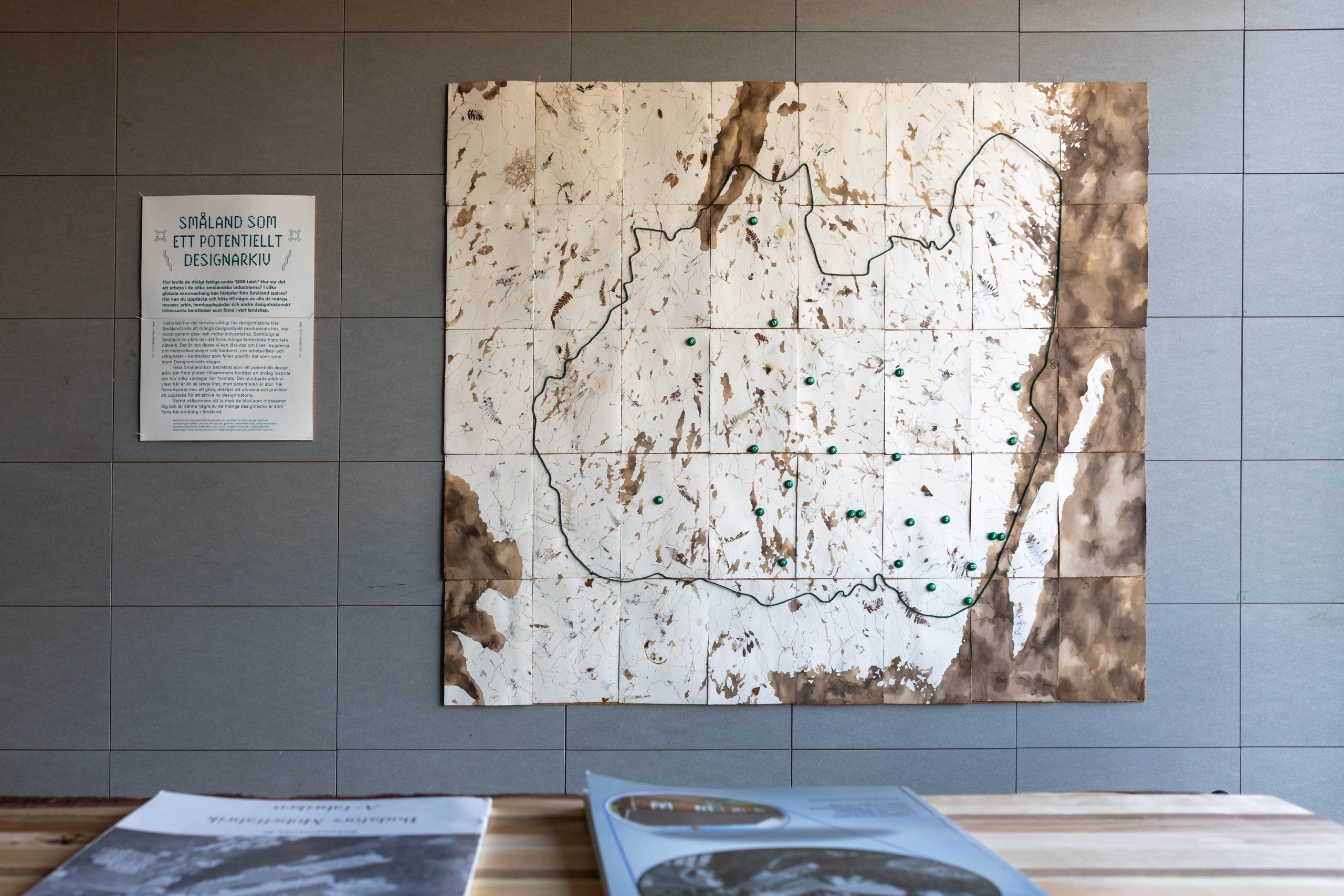 I denna gestaltning, med grafisk form av Lisa Olausson, har några av de många småländska designhistorier vi lärde känna under projektet Lära om arkivet fått en fysisk form. Brokighet, tillgänglighet, hantverksmässighet har varit några av gestaltningens nyckelord. Här visas flera element från Lära om arkivets olika projekt. Smålandskartan, formgiven av Evelina Mohei med papper från Lessebo handpappersbruk, är central i projektet med sin perspektivsammanflätande funktion, illustratören Annika Elmqvists illustrationer på glas hyllar det historieskrivande projektet och förebilden Glasriket – människan, miljön, framtiden och på bord av skadat trä, framtagna av MADAM snickeri, finns ett antal lokala designhistoriska titlar – läs om luffarnas liv och leverne, om livet på Bodafors möbelfabriker och mycket mer.