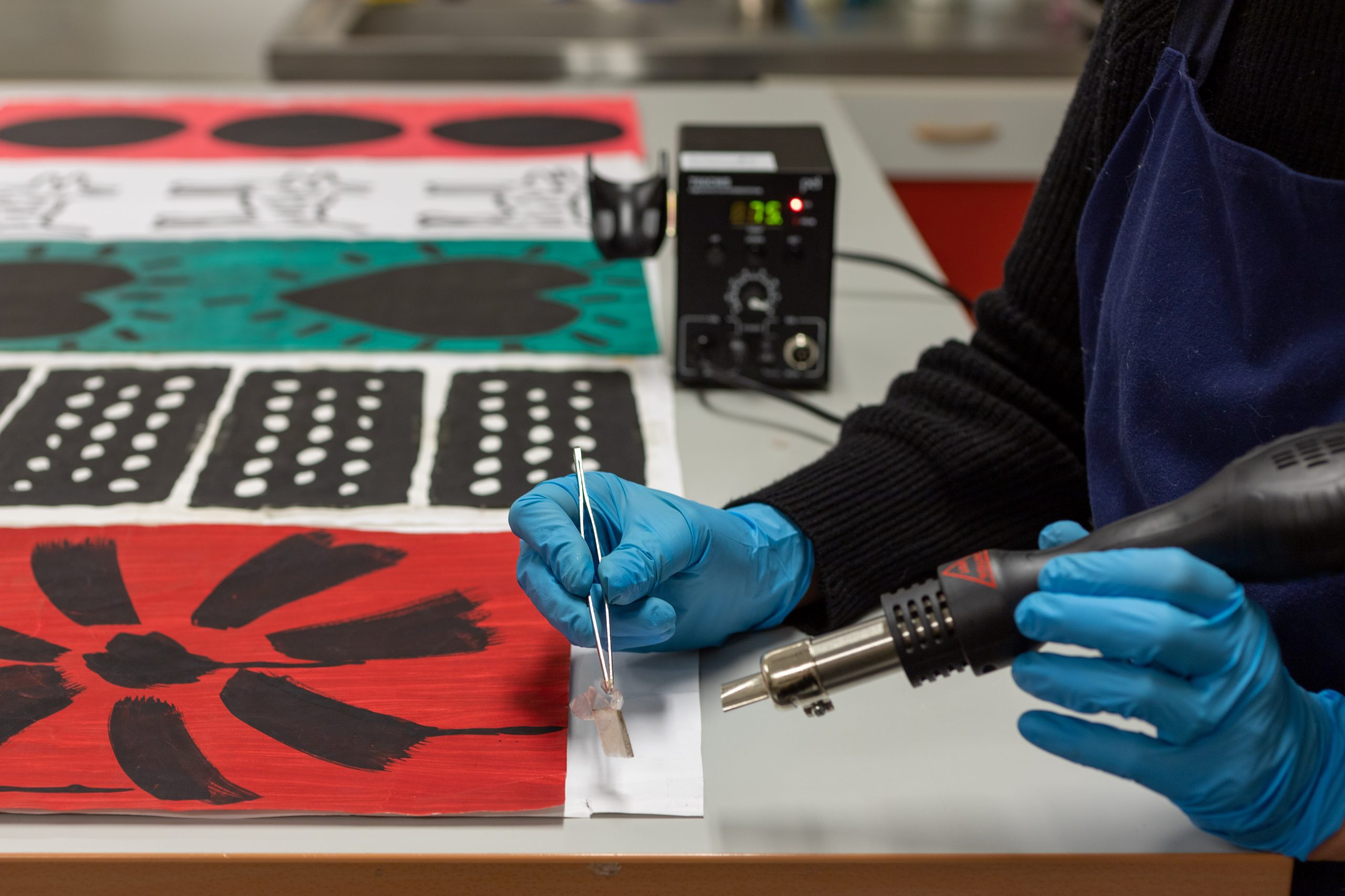 Designarkviets konservator avlägsnar tejp från en skiss till 10-gruppens Happy Birthday-kollektion av Birgitta Hahn (1996). Foto: Designarkivet