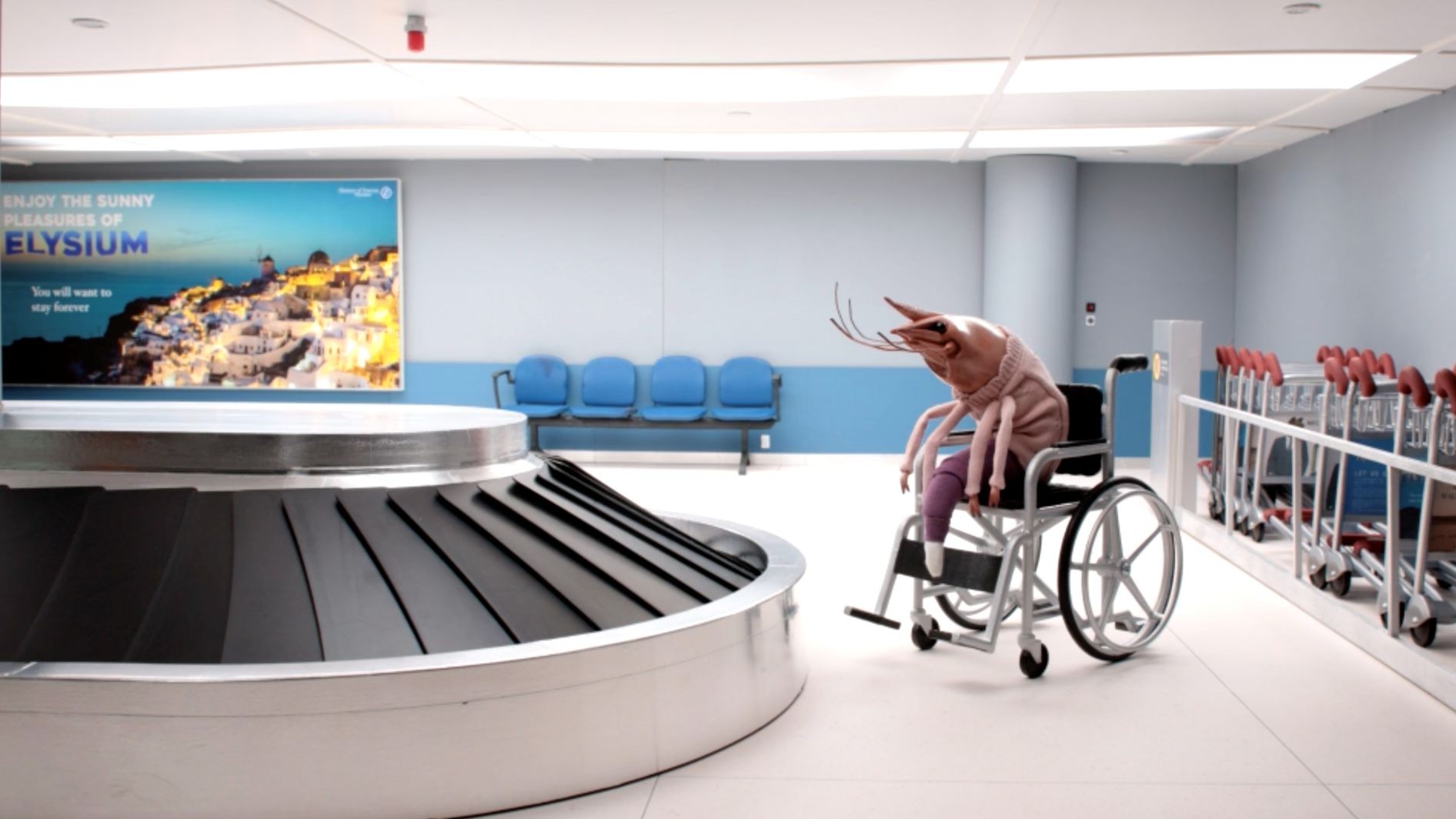 Where are we really going? In Terminal, Niki Lindroth von Bahr’s cute, anthropomorphic creatures stare into the abyss from the monotony of the airport.