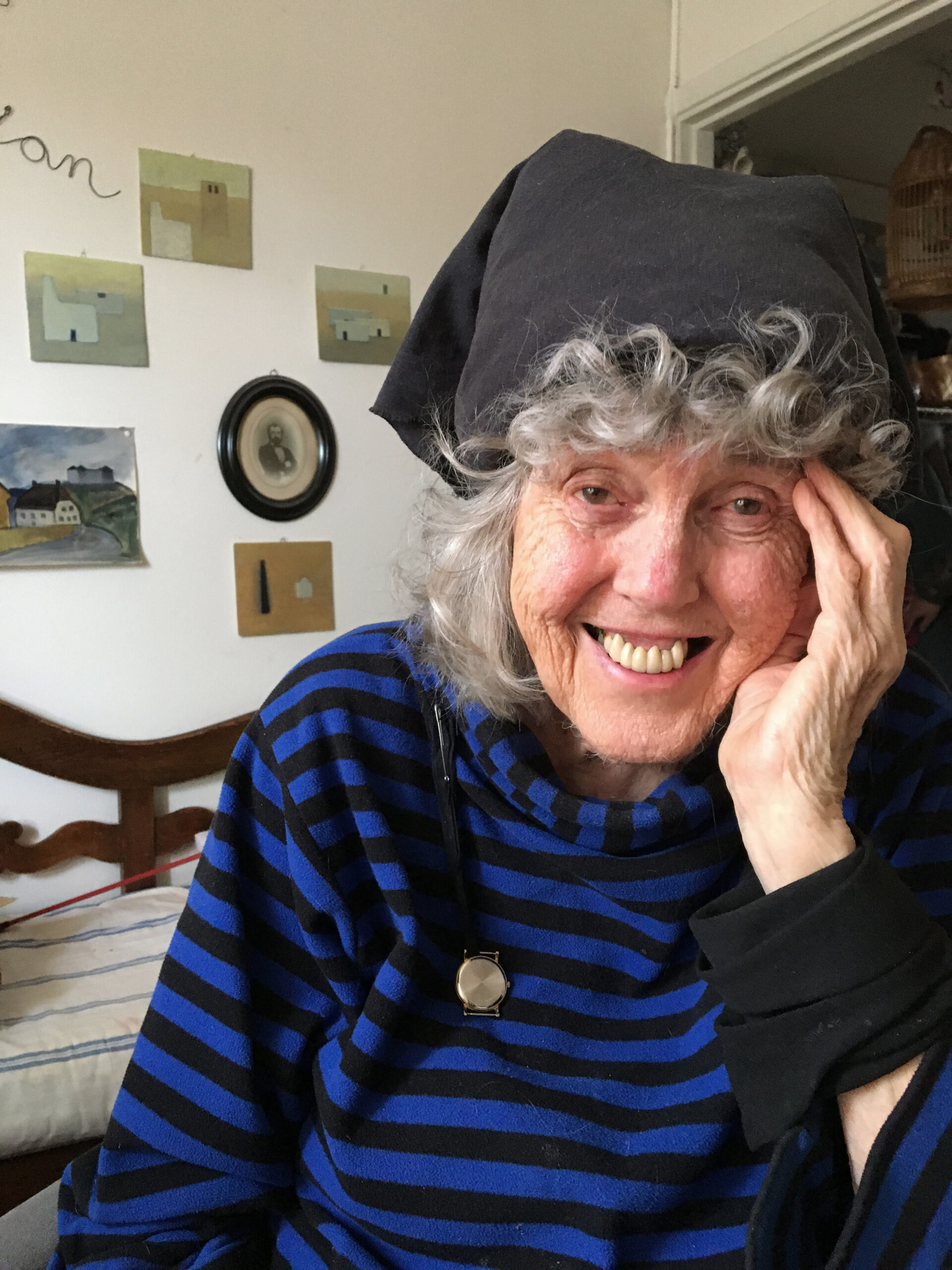 Till sist gör kroppens tillkortakommande sig än mer påminda. Men hon släpper inte pennan utan fortsätter att teckna det hon ser och upplever. Humorn och blicken för det absurda håller henne vid liv. Under de sista dagarna på sjukhus och vårdboende tecknar hon amputationen av sina ben på Landstingets kuvert. Allt fler änglar fladdrar omkring på hennes papper. Kort därefter går hon bort, 2017, 95 år gammal.